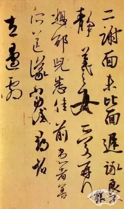 张旭肚子痛,一时有感,发于笔端,随手写下一个字条,竟成了千古名帖《肚痛帖》。全帖六行30字,文日:“忽肚痛不可堪,不知是冷热所致,欲服大黄汤,冷热俱有益。如何为计,非临床。”这幅作品开头的三个字,写得还比较规正,字与字之间不相连接。从第四字开始,便每行一笔到底,上下映带,缠绵相连,越写越快,越写越狂,越写越奇,意象迭出,颠味十足,将草书的情境表现发挥到了极致。可以看出,张旭这种纵横豪放的情怀,张扬恣肆的渲泄,泰山压顶的气概,变幻莫测的态势,在奋笔疾书的狂草中,横空出世,让观者惊心动魄。