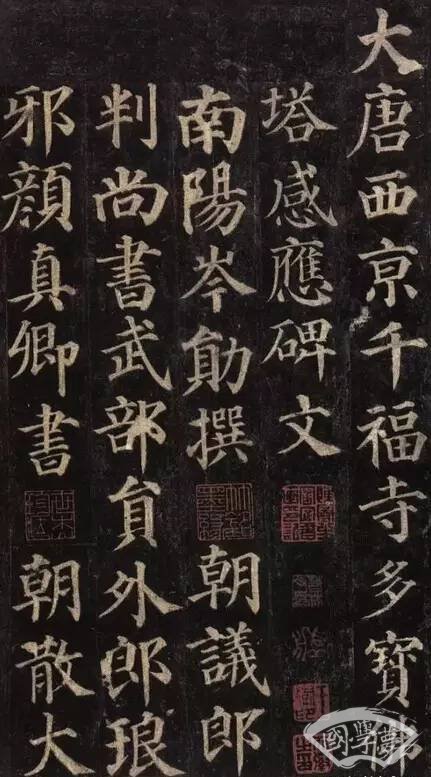 《多宝塔碑》,此碑是颜真卿44岁时书,整篇结构严密,点画圆整,秀丽刚劲,虽尚未形成刚劲雄强、沉雄浑厚、大气磅礴的颜楷风格,但此碑已奠定了颜真卿书风的基本格调,它是留传下来的颜书中最早的楷书作品,结构平稳端正,严谨庄重,是唐代“尚法”的代表碑刻之一,学颜体者多从此碑下手,入其堂奥。