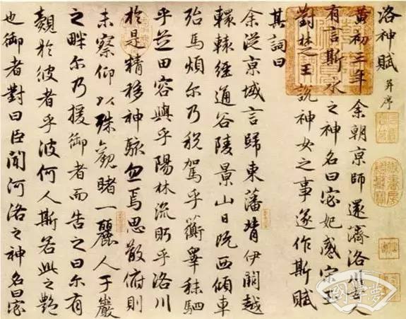 《洛神赋》即为赵氏行书代表作。《洛神赋》原名《感甄赋》,其写作牵涉到曹植与魏文帝曹丕之妃甄氏之间的一段错综复杂的感情。赵孟頫《洛神赋》,行中兼楷的结体、点画,深得二王遗意。