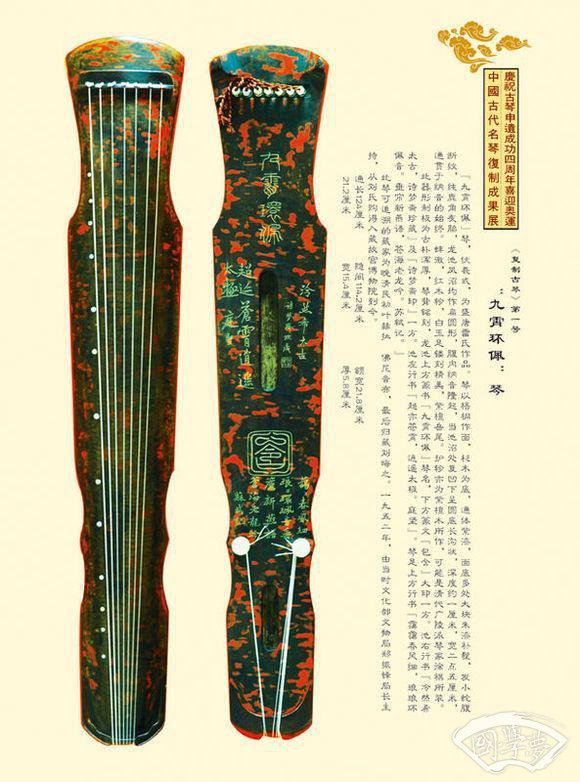 琴面以微隆起之势成纳音。龙池内有唐宫琴格式之寸许大字“至德丙申”隶书腹款。至德丙申为唐肃宗元年(公元756年),为中唐之始。琴背池上阴刻篆书“九霄环佩”,是为琴名;龙池下刻“清和”篆印,二印均为唐代原刻,尚有原填金漆痕迹。此琴原为上海文史馆馆员沈迈士先生旧藏,后转让吴金祥先生处藏,早年流失海外。