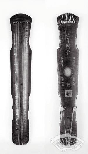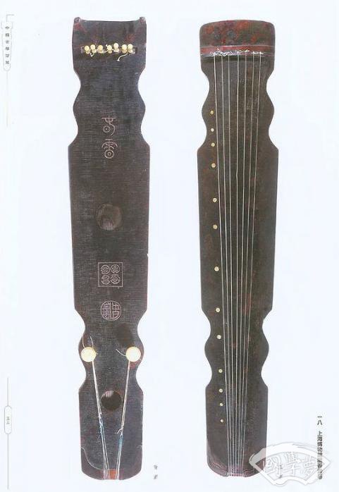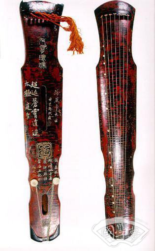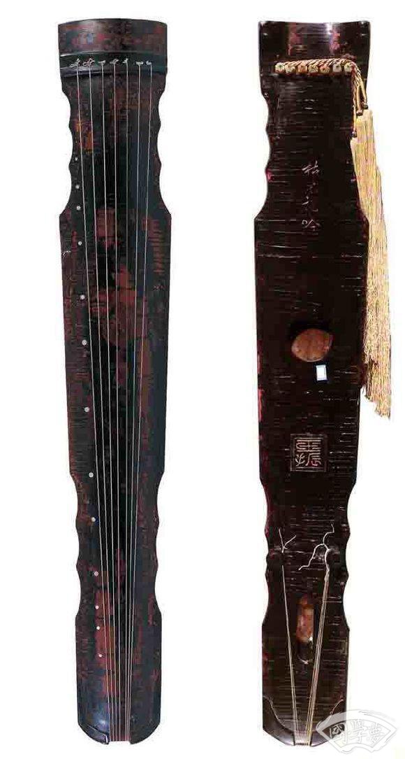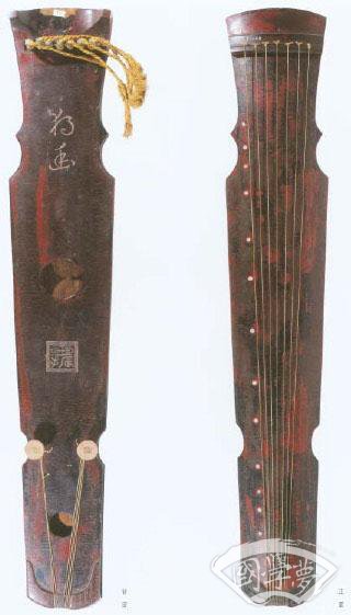 独幽琴 晚唐 长120.5cm 肩宽20cm 尾宽14cm 湖南省博物馆藏凤嗉式。琴面黑红相间漆,梅花断纹与蛇腹断纹交织,背面牛毛断纹。龙池上方刻“独幽”,池内有“太和丁未”四字(即唐文宗元年,公元827年)。琴尾有李静题款。此琴于明末清初为王船山所用,民国时由已故湖南琴家李静珍藏。