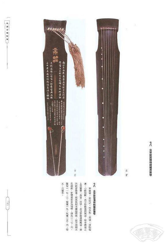 长 宽 厚 :长 122.6 宽(额 19.2,肩 19,尾13.5)厚 5.9 公分漆色断纹:通体原髹黑漆,漆胎不厚,漆色黯黑有光,现琴面朱漆系后人所加,底板大体保持原样。 蛇腹断,局部兼牛毛断。 此琴曾由著名琴家汪孟舒珍藏,并补髹朱漆,磨工未竟而止。 琴面之象牙末、孔雀石漆灰等处亦系汪氏所补。琴材配件:玉轸,玉雁足。