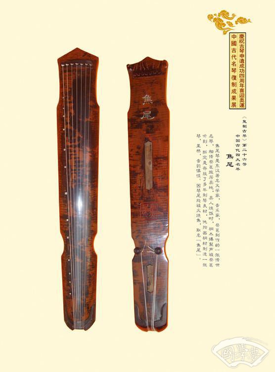“焦尾”是东汉著名文学家、音乐家蔡邕亲手制作的一张琴。蔡邕在“亡命江海、远迹吴会”时,曾于烈火中抢救出一段尚未烧完、声音异常的梧桐木。他依据木头的长短、形状,制成一张七弦琴,果然声音不凡。因琴尾尚留有焦痕,就取名为“焦尾”。“焦尾”以它悦耳的音色和特有的制法闻名四海。